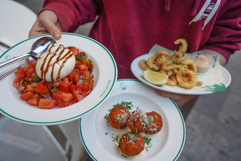 Gellafrenda’s mixed tomato salad, pecorino and mozarella arancini and calamari fritti.